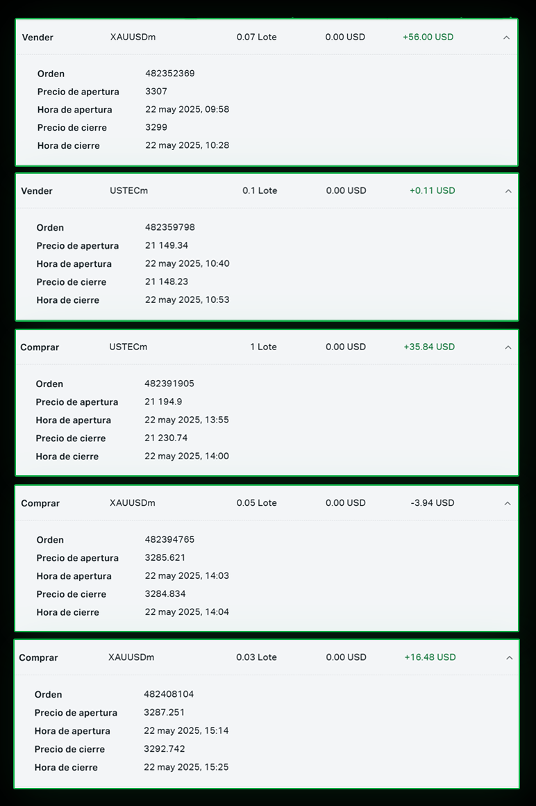 Comenzando con una cuenta con US$ 1.000, en un solo día logré generar US$ 104 con cinco operaciones.