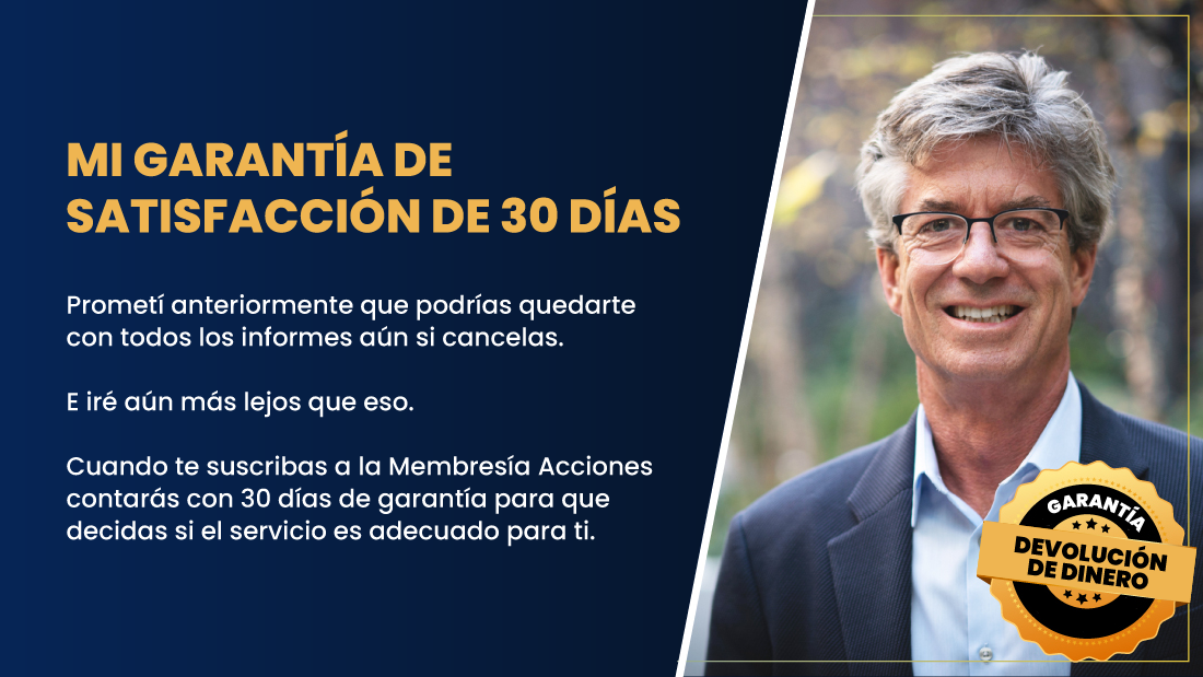 Y si sientes que no he cumplido en ningún aspecto, puedes obtener un reembolso completo en cualquier momento durante los primeros 30 días (lo único que no te devolveremos serán los US$ 20 invertidos en las siete acciones de Inteligencia Artificial en caso de que se haya realizado el giro).