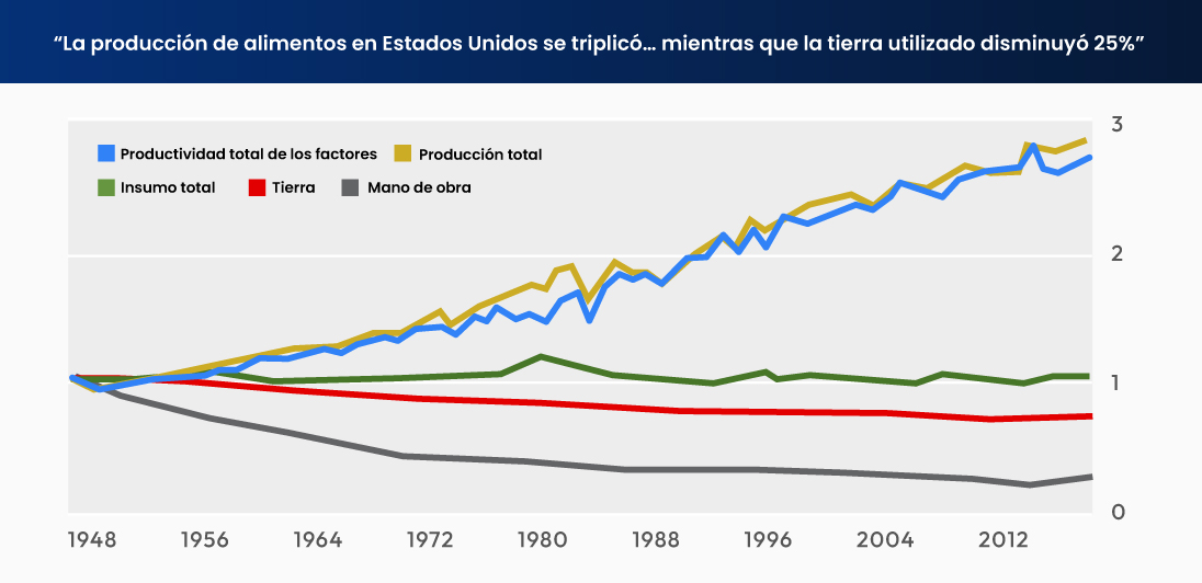 En Estados Unidos, hemos triplicado nuestra producción de alimentos... ¡mientras hemos reducido nuestro uso de la tierra en un 25% y la mano de obra en casi un 75%!