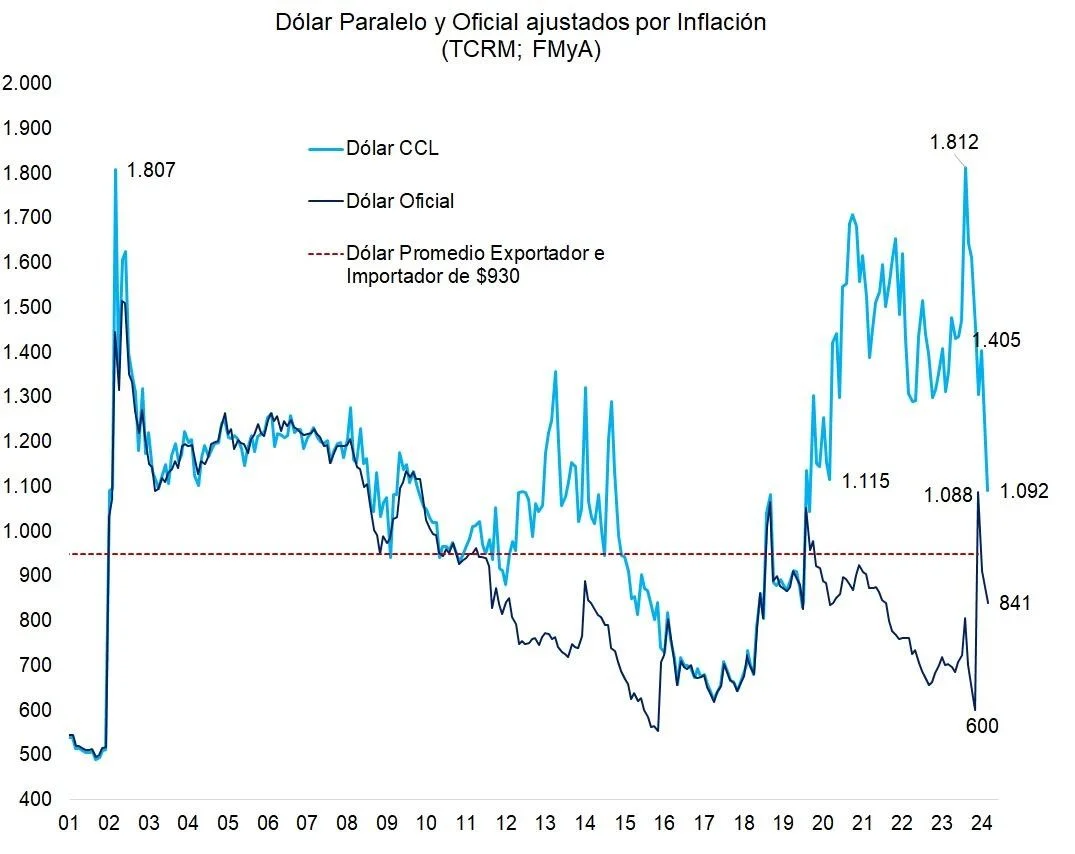 El dólar contado con liquidación, ajustado por inflación, llegó a estar en 1.812 pesos por dólar y está un poco por arriba de 1.000 pesos por dólar. También en el cuadro podemos ver el precio del dólar oficial, la línea azul y el precio promedio de exportador e importador la línea punteada roja.